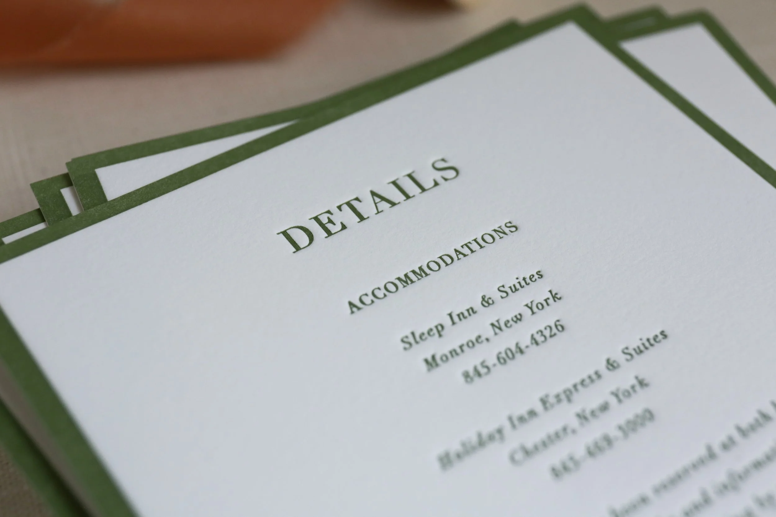 Inspired by the venue, summer florals, and Ashley’s beautiful dress, we started designing. And because invitations are the first impression guests have of the wedding, we wanted Ashley & Sean’s to communicate exactly what their vibe was – summer, farm & floral.To start, we knew that in order to elevate the design, we had to create letterpress wedding invitations. From there, I leaned into Ashley’s love of flowers, creating a watercolor border of summer wildflowers that surrounded the most gorgeous, deep letterpress impression. For the details card, I kept it simple with a letterpressed border and lush green ink to color-match the envelopes.Finally, to tie it all together, I suggested a handmade, burnt orange silk ribbon – a nod to Ashley’s stunning gown and her favorite color. And I have to admit, seeing the design come to life, I absolutely loved how they came out.